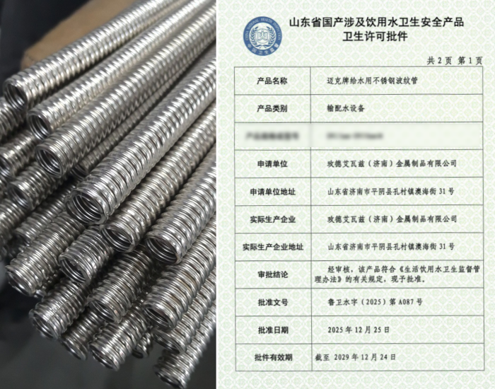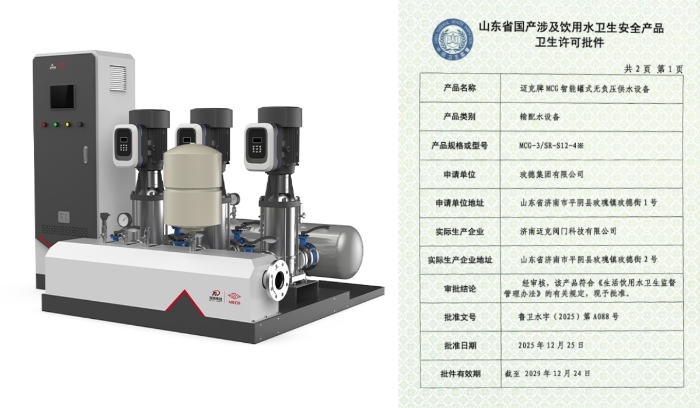 近日,旺财28-科技赋能场景,让娱乐更有趣!-pgwc旗下三类给水系列产品成功取得卫生许可批件,标志着集团在民用及市政给水领域的合规性与安全性获得权威认可。本次获批产品包括:旺财28-科技赋能场景,让娱乐更有趣!-pgwc有限公司生产的“迈克牌MCG智能罐式无负压供水设备”、济南迈克阀门科技有限公司生产的“迈克牌给水用EPDM型三元乙丙橡胶密封垫”以及玫德艾瓦兹(济南)金属制品有限公司生产的“迈克牌给水用不锈钢波纹管”。