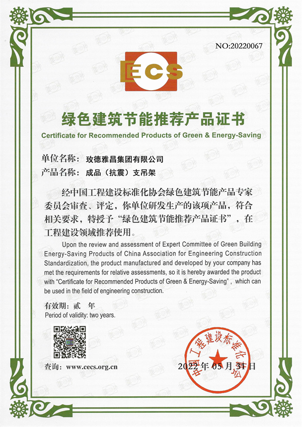 玫德雅昌支吊架产品拥有齐全的检测报告及国际权威认证,主编及参编多项支吊架相关的国家和行业标准,产品获得中国建筑标准设计研究院颁发的高品质认证、绿色建筑节能推荐产品证书,并通过FM/UL国际认证。